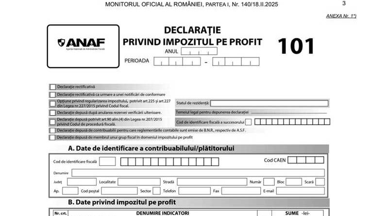 In Monitorul Oficial al Romaniei nr. 140 din 18 februarie 2025, s-a publicat Ordinul presedintelui Agentiei Nationale de Administrare Fiscala nr. 206/11 februarie 2025 pentru aprobarea modelului, continutului si instructiunilor de completare a formularelor 101 “Declaratie privind impozitul pe profit” si 101 Grup fiscal “Declaratie consolidata privind impozitul pe profit determinat de grupul fiscal”.